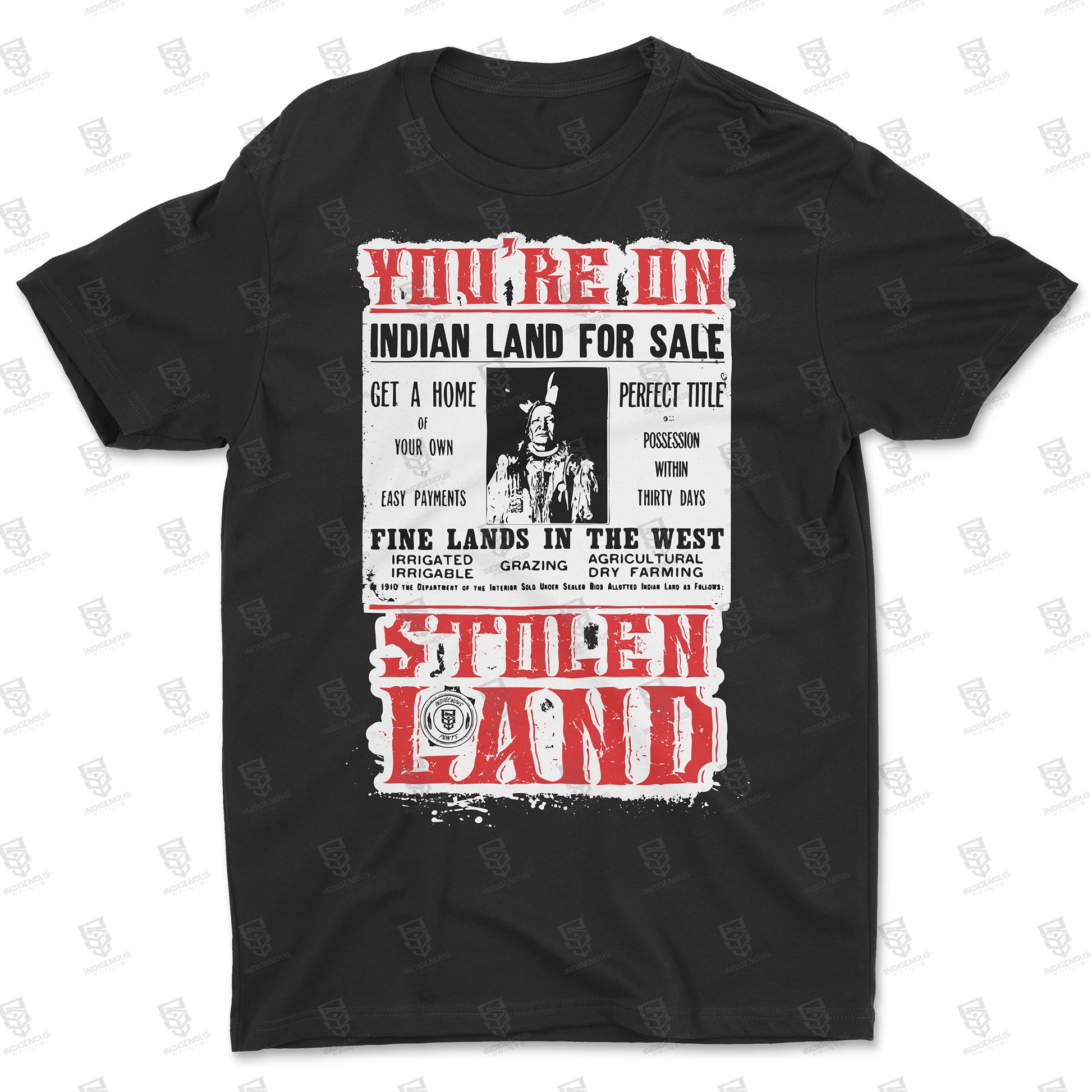 Our Stolen Land shirt was designed using a real newspaper ad. This advertisement from the U.S. Department of the Interior was made in 1911. The man pictured, Not Afraid Of Pawnee.